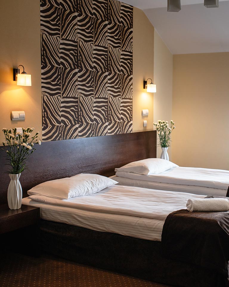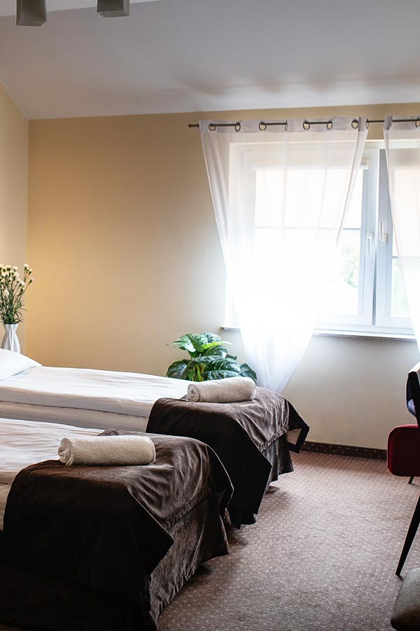 Zależy nam, aby każdy gość czuł się jak w domu. Dlatego w każdym pokoju znajdziesz wygodne łóżka z wysokiej jakości pościelą, stylowe wnętrza utrzymane w spokojnej kolorystyce, dodatkowe udogodnienia, takie jak czajnik, żelazko i suszarka, dostępne na życzenie.